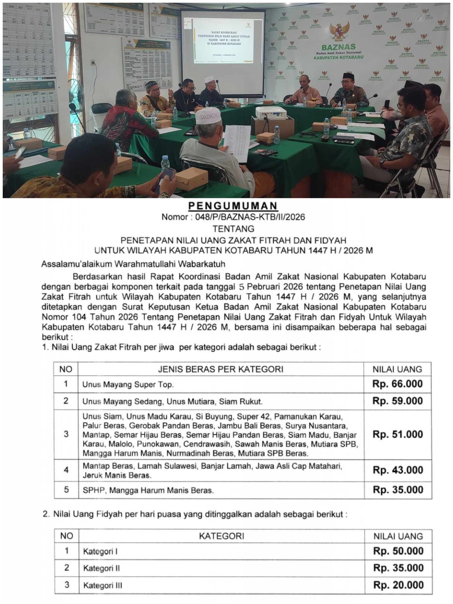 Penetapan tersebut merupakan hasil rapat koordinasi BAZNAS Kabupaten Kotabaru bersama unsur terkait yang dilaksanakan pada Rabu (5/2/2026). Hasil rapat kemudian dituangkan dalam keputusan tentang Penetapan Nilai Uang Zakat Fitrah dan Fidyah sebagai pedoman pelaksanaan zakat di bulan Ramadan.
