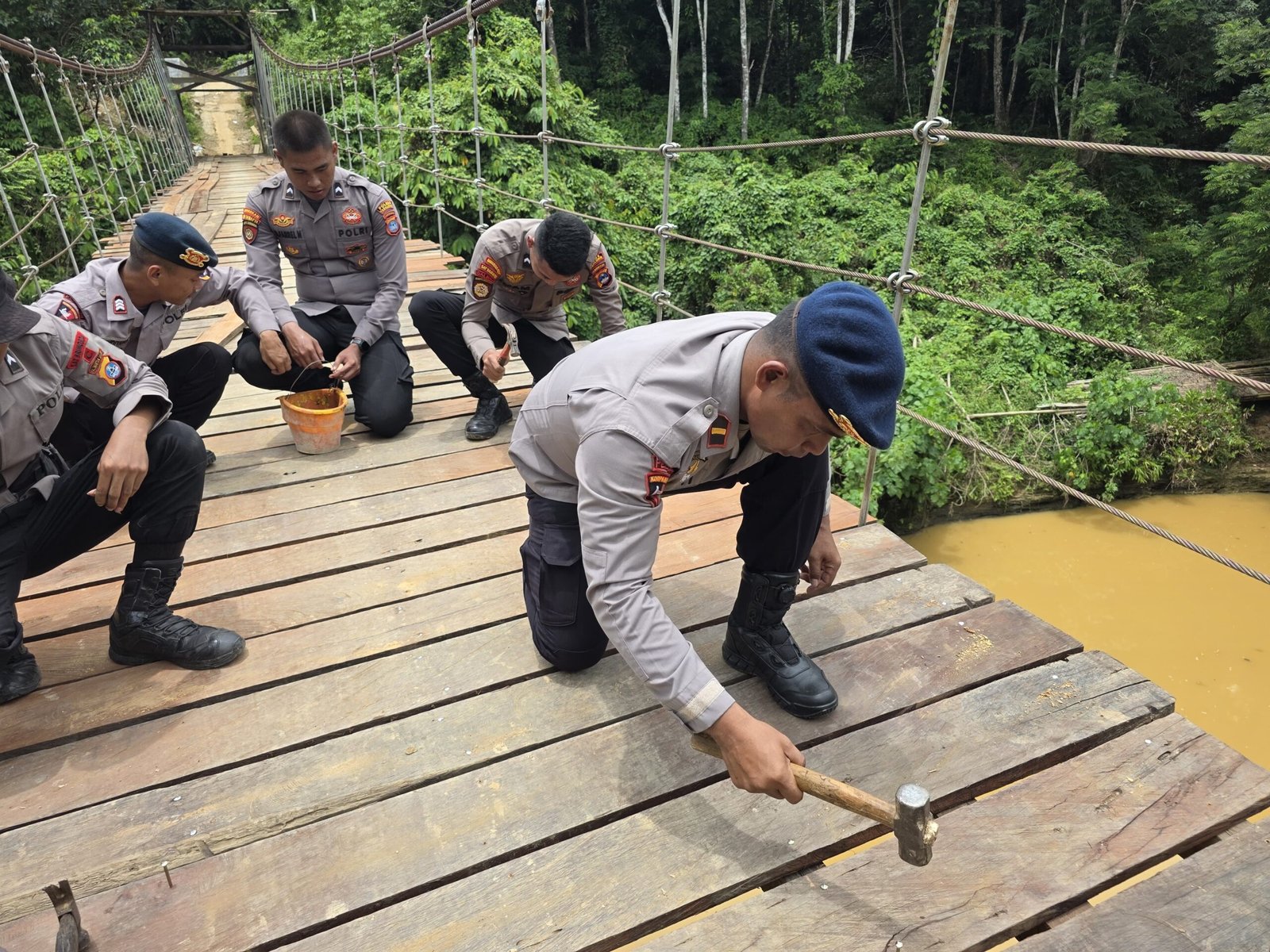 Keesokan harinya, Senin (9/3/2026), personel Polri melanjutkan pekerjaan teknis seperti pengeboran papan lantai dan pemasangan papan kayu ulin yang digunakan sebagai lantai jembatan gantung.