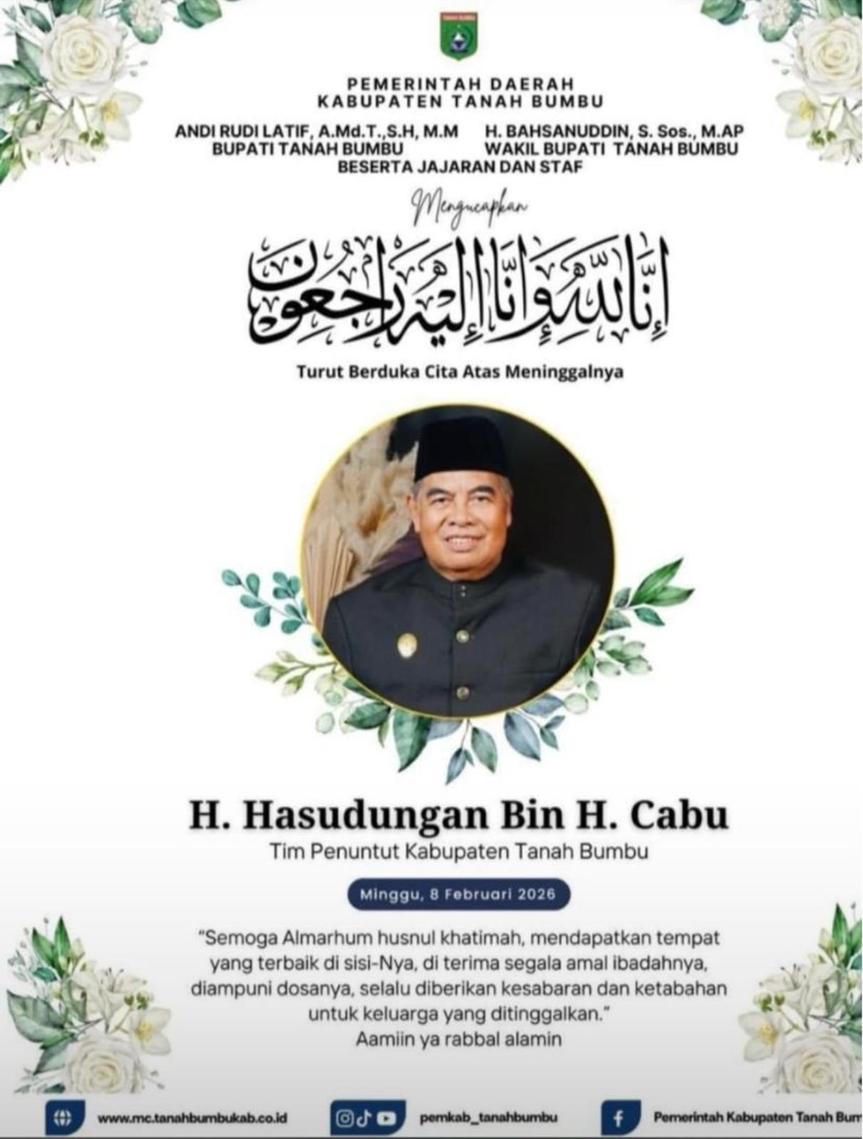 Meski telah berpulang, jejak perjuangan dan pengabdian H. Hasudungan akan terus hidup dan dikenang sebagai bagian penting dari lahirnya Kabupaten Tanah Bumbu.