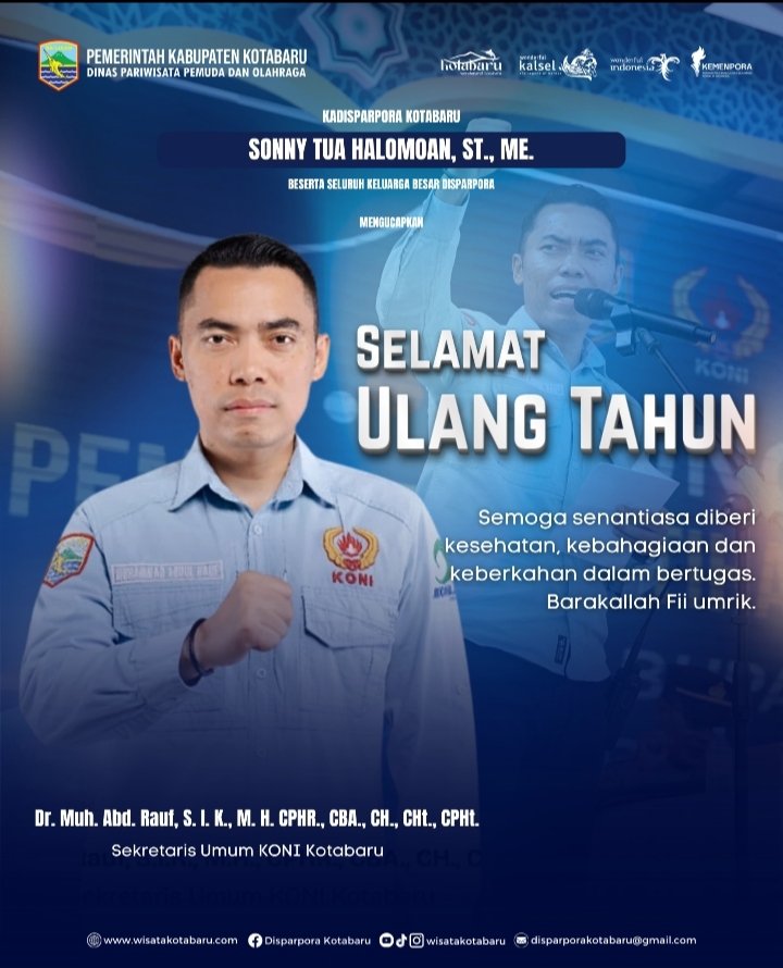 Kotabaru – Kepala Dinas Pariwisata, Pemuda dan Olahraga (Disparpora) Kabupaten Kotabaru, Sonny Tua Halomoan, ST., ME., bersama seluruh jajaran dan keluarga besar Disparpora Kotabaru, menyampaikan ucapan selamat ulang tahun kepada Sekretaris Umum KONI Kotabaru, Dr. Muh. Abd. Rauf, S.I.K., M.H., CPHR., CBA., CH., CHI., CPHt.
