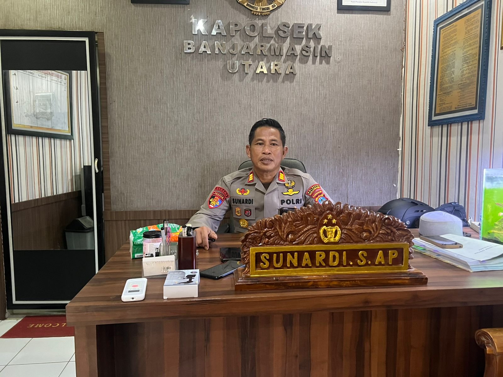 Kapolsek Banjarmasin Utara, Sunardi.S.A.P. memberikan keterangan kepada wartawan pijarkalimantan.com di ruang kerjanya terkait pengamanan Ramadan di Banjarmasin Utara.