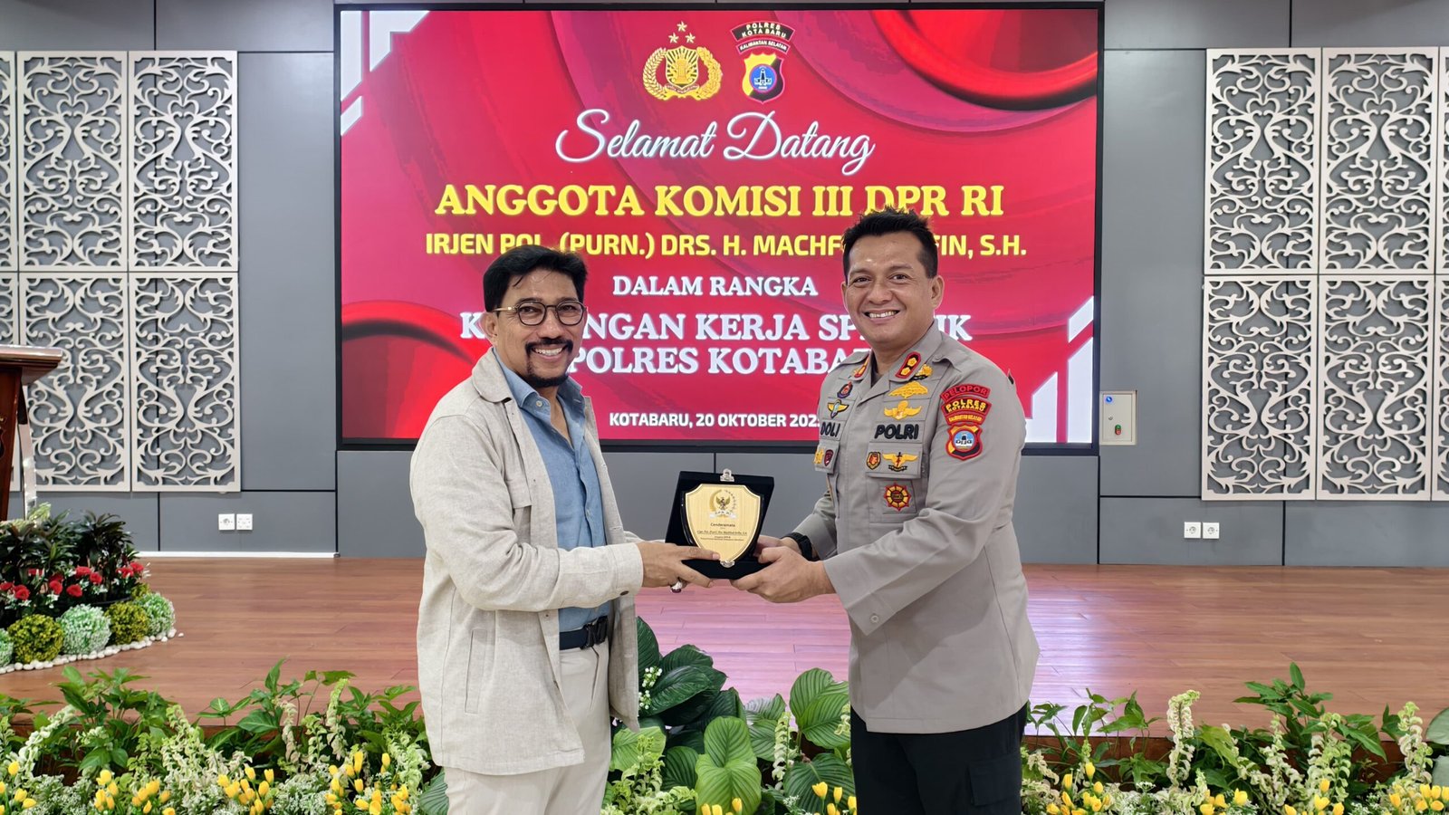 Sebagai penutup rangkaian kegiatan, dilakukan penyerahan pelakat cinderamata dari Anggota Komisi III DPR RI Irjen Pol (Purn) Drs. H. Machfud Arifin, S.H., kepada Kapolres Kotabaru AKBP Doli M. Tanjung, S.I.K., sebagai bentuk apresiasi dan simbol sinergitas antara lembaga legislatif dan Kepolisian dalam menjaga keamanan serta pelayanan publik di daerah.