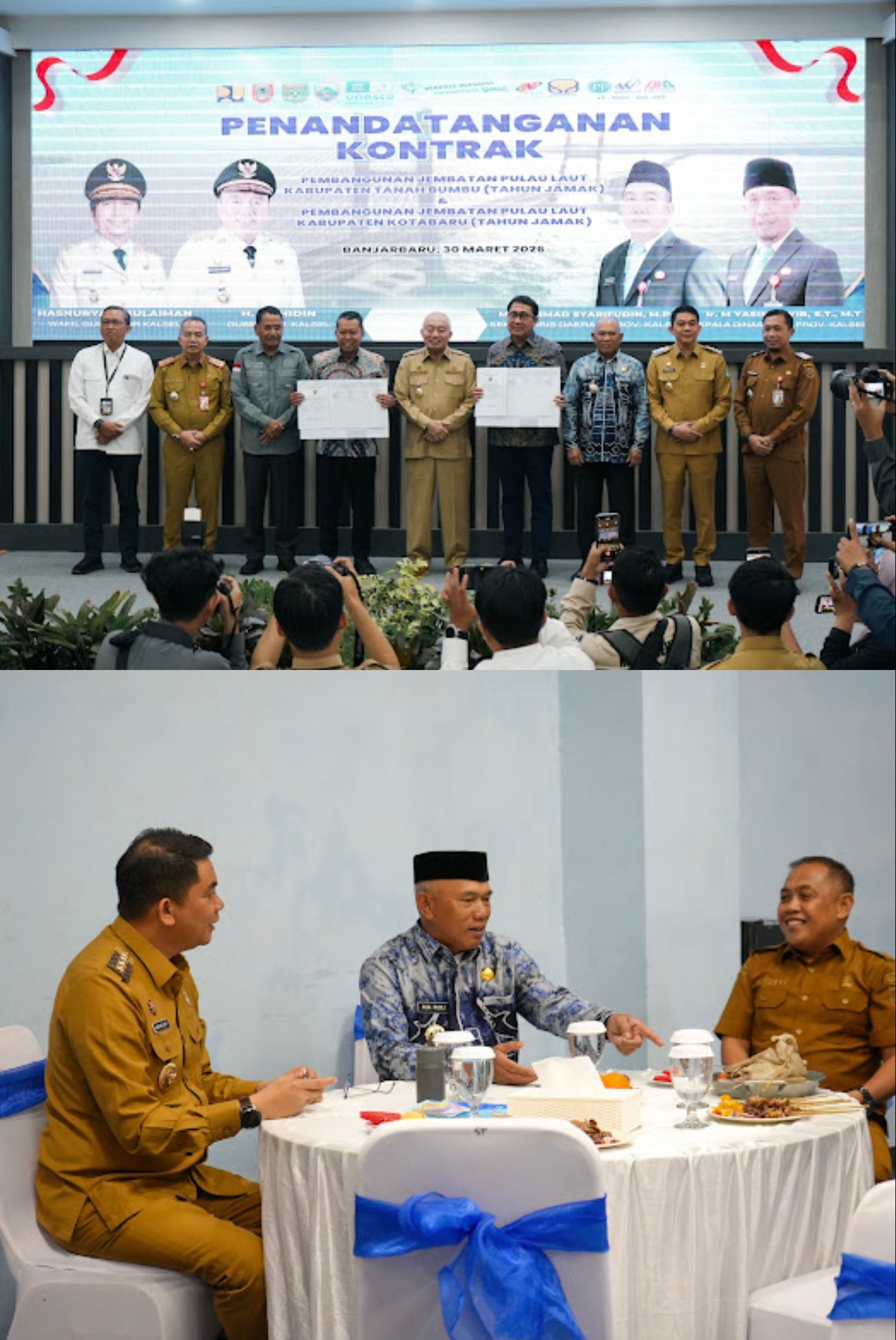 Pijarkalimantan.com, Banjarbaru – Bupati Kotabaru H. Muhammad Rusli, S. Sos Hadiri Penandatanganan Proyek Strategis Pembangunan Jembatan Pulau Laut yang memasuki tahap lanjutan kontrak kerjasama antara Pemerintah Provinsi Kalimantan Selatan dan Pemerintah Kabupaten Kotabaru serta Pemerintah Kabupaten Tanah Bumbu, yang berlangsung di Aula Kantor Dinas Pekerjaan Umum dan Penataan Ruang Provinsi Kalimantan Selatan, Banjarbaru. Senin (30/03/2026).