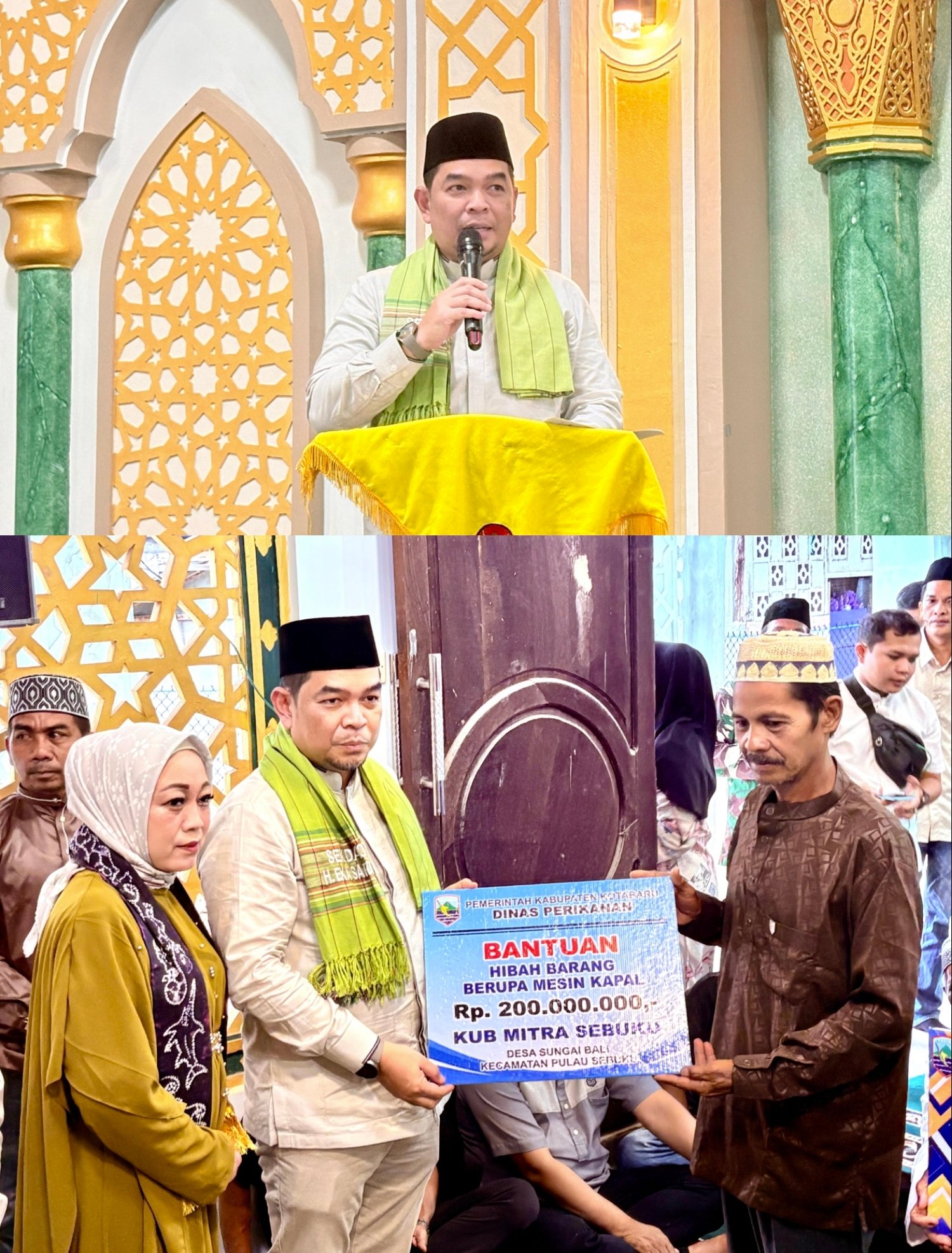 Serta diserahkan juga hibah barang berupa mesin kapal sebesar Rp. 200. 000. 000,- dan peralatan pengolahan pemasar dan pengumpul hasil perikanan sebesar Rp. 100. 000. 000,- dari Dinas Perikanan.