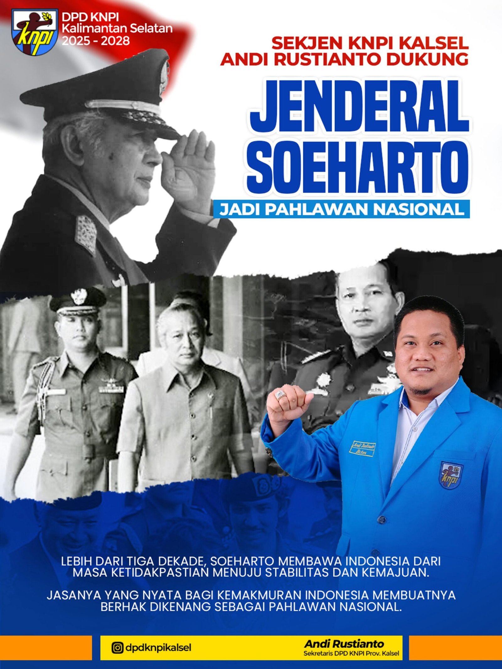 Pijarkalimantan.com, Kotabaru – Sekretaris DPD KNPI Kalimantan Selatan, Andi Rustianto, menyatakan dukungan penuh terhadap langkah pemerintah untuk menganugerahkan gelar Pahlawan Nasional kepada Presiden Republik Indonesia ke-2 Soeharto, dengan alasan jasa-jasa beliau yang besar dalam memperjuangkan kemerdekaan dan pembangunan bangsa.