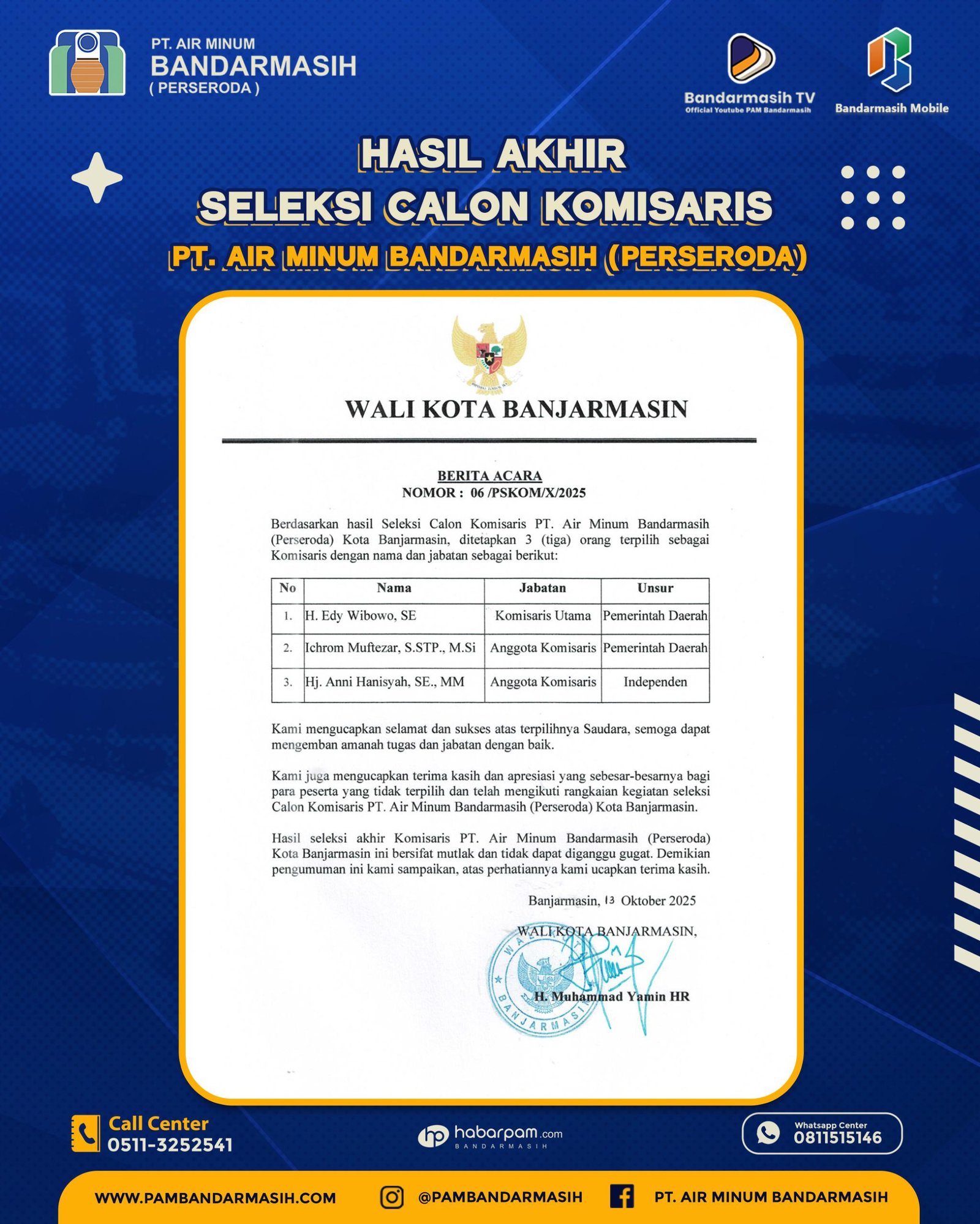 BANJARMASIN – Wali Kota Banjarmasin H. Muhammad Yamin HR resmi menetapkan tiga anggota Dewan Komisaris PT Air Minum Bandarmasih (Perseroda) melalui Berita Acara Nomor: 06/PSKOM/X/2025, yang ditandatangani pada Senin (13/10/2025).